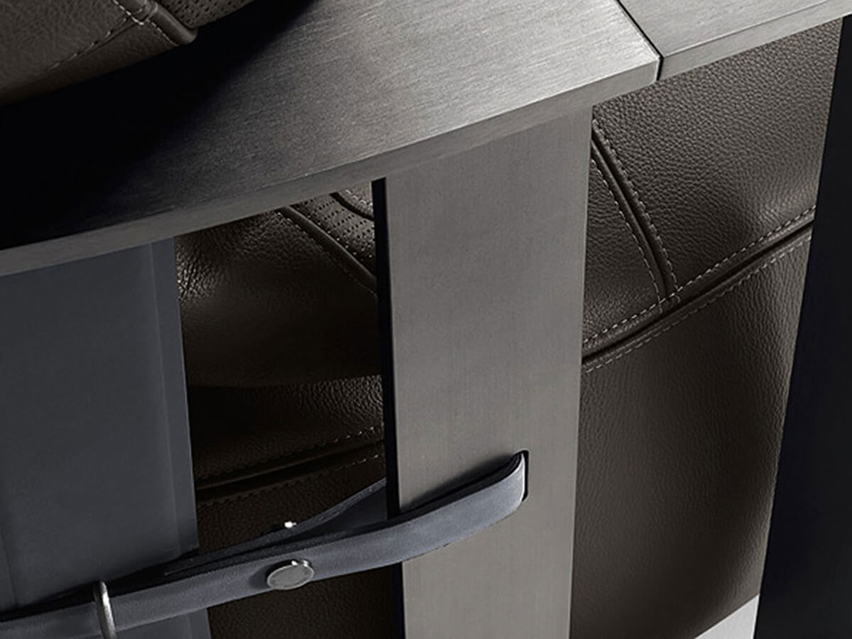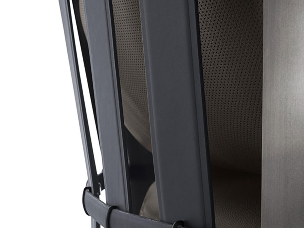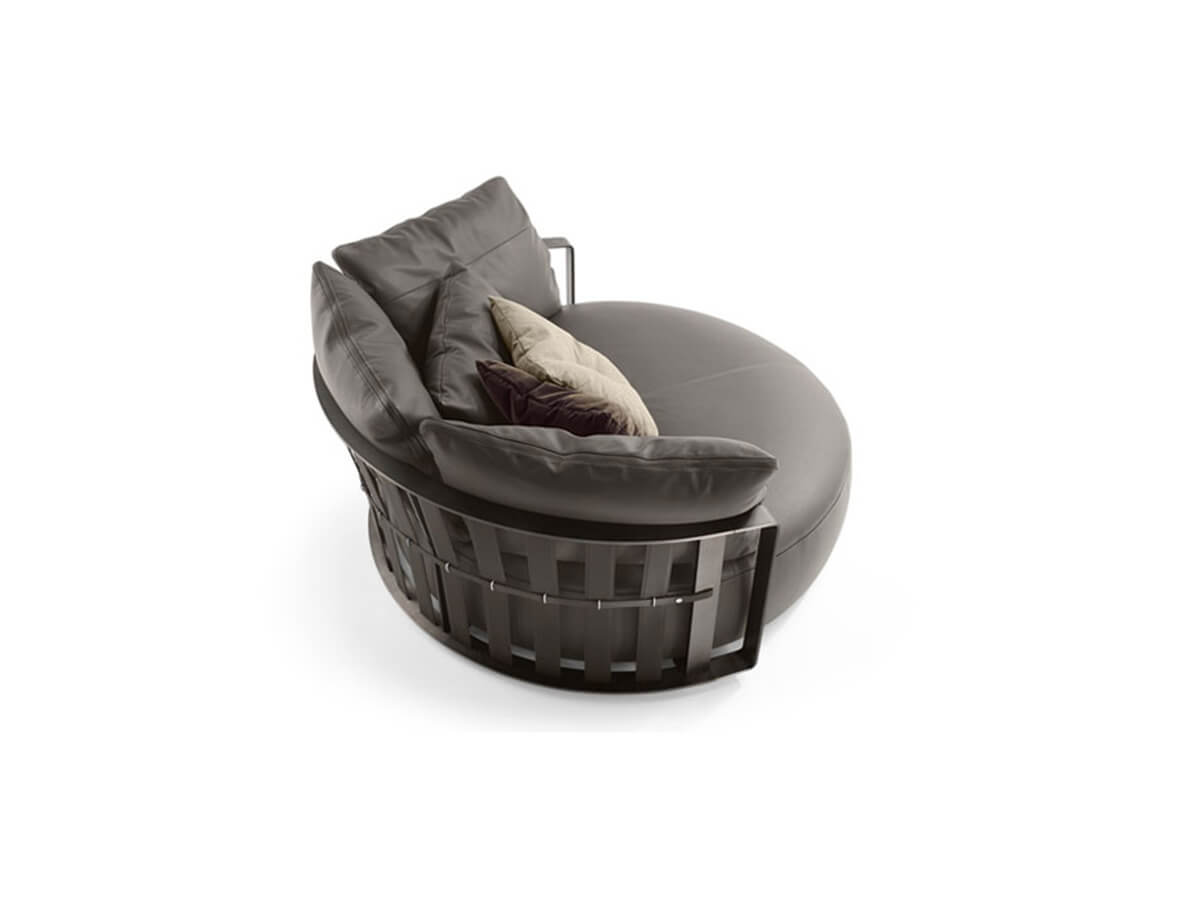 The Scarlett sofa redefines elegance with its bold circular design and spacious proportions, making it a striking centerpiece for any living space. Encircled by a burnished steel ring that serves as both armrest and backrest, it offers ultimate comfort with cushions filled with goose down and polyurethane. Upholstered in premium Pelle Frau® leather, Scarlett combines luxurious materials with exceptional craftsmanship. Designed for versatility, it features a base with eight unidirectional wheels, allowing smooth 360° rotation to suit your spatial needs.